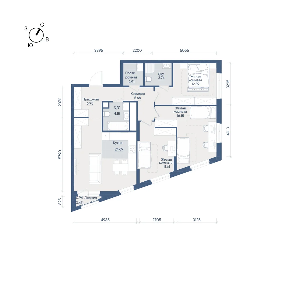 3-комнатная  88.74 м2